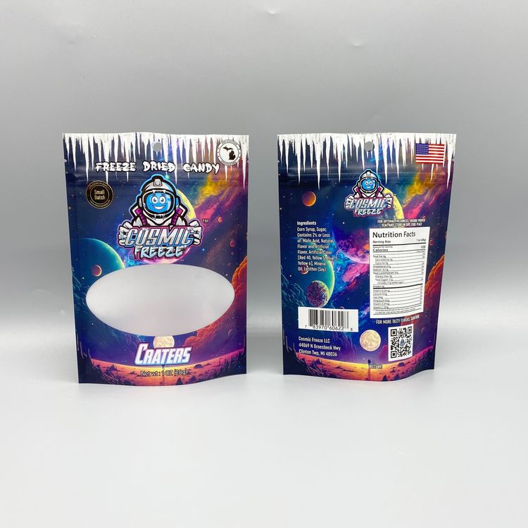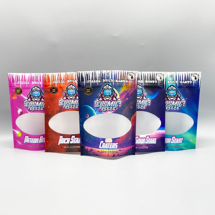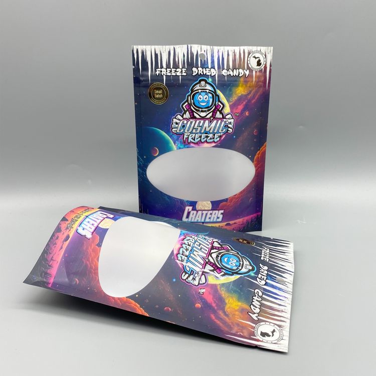 凍干糖果袋采用了時尚的鐳射膜材質,結合自立袋設計及獨特的開窗特性,為現代消費者提供了一種既實用又具吸引力的包裝方案。