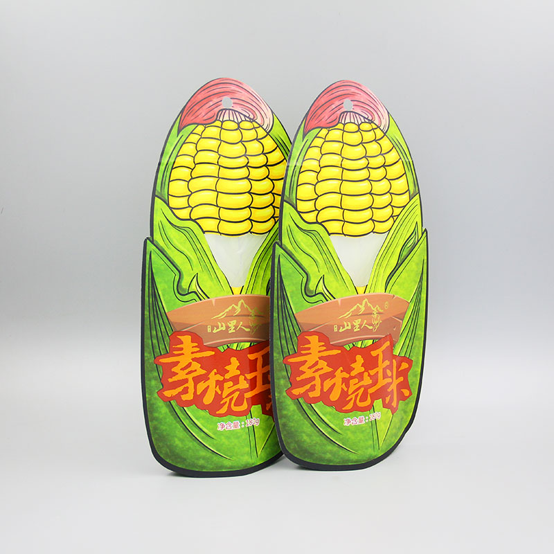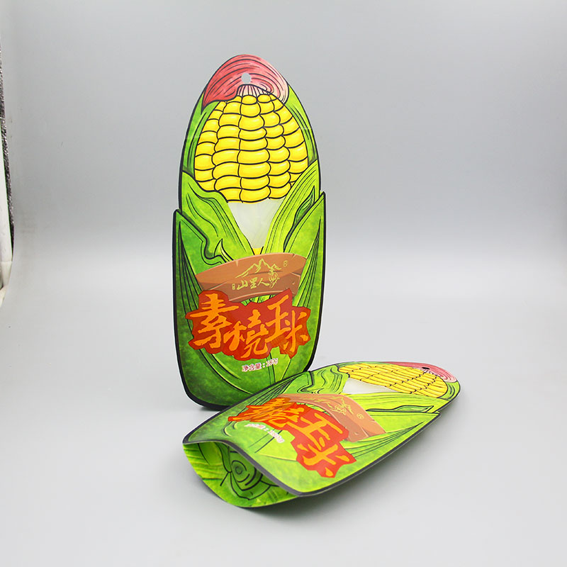 本產品為啞光油白牛皮紙揩開窗 異形袋 ,牛皮紙密封性好,平整度高,手感更加細膩,成袋挺括,白牛皮紙底色是白色,不會與其他顏色疊加,因此印刷效果好。袋子設計成玉米的形