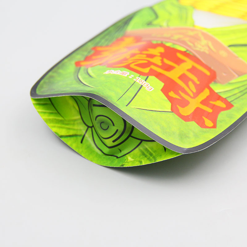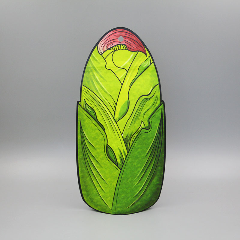 本產品為啞光油白牛皮紙揩開窗異形袋,牛皮紙密封性好,平整度高,手感更加細膩,成袋挺括,白牛皮紙底色是白色,不會與其他顏色疊加,因此印刷效果好。袋子設計成玉米的形狀,具有新穎、簡單、明確、好識別、凸顯品牌形象等特點。拉鏈設置在背面,保證正面圖案完整。