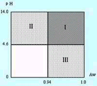 在日本,根據厚生省告示第 17 號“容器包裝、充填加壓加熱殺菌食品”的標準中被定義為 如圖 1 所示 pH 值超過 4.6 、且水分活性超過 0.94 的范圍,在充填該類食品進行加熱加壓時,必須對中心部采取以 120 ℃ 、加熱 4 分鐘的方法或與其具有同等效力以上的方法進行殺菌。