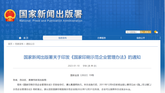 2023年1月10日,國家新聞出版署官網發布《國家印刷示范企業管理辦法》,2011年12月6日新聞出版總署印發的《國家印刷復制示范企業管理辦法》同時廢止。原認定的國家印刷復制示范企業到2022年12月31日失效,企業可以按照本辦法重新申報。《辦法》提出,國家印刷示范企業分為四類:保障支撐類、創新引領類、智能制造類、專業特色類。國家新聞出版署每兩年組織開展一次國家印刷示范企業的評審認定。