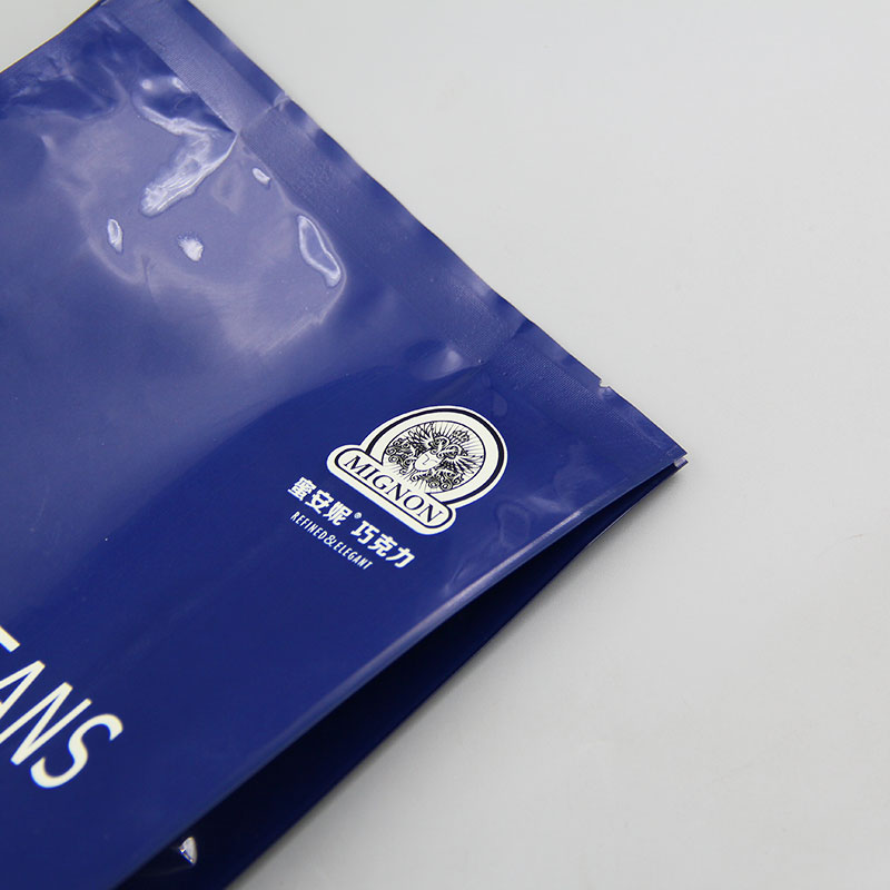 本產(chǎn)品為亮面鍍鋁 四邊封包裝袋 ,鍍鋁層具有一定的遮光作用,阻隔性較強,巧克力一般會使用鋁箔包裝。亮面更能體現(xiàn)鋁箔的光澤感,二者適配性更高。四邊封從包裝材料和生產(chǎn)設(shè)