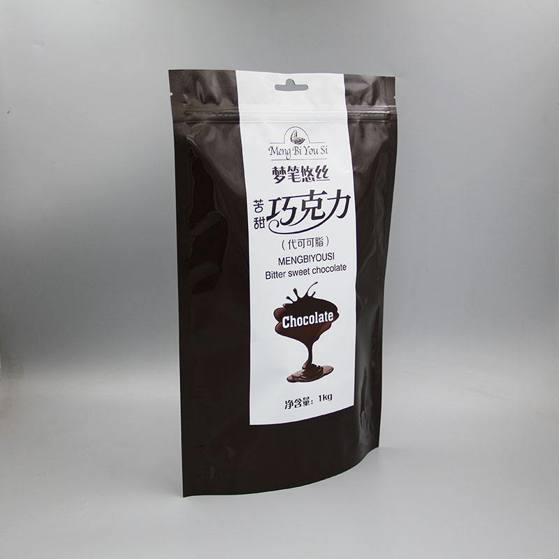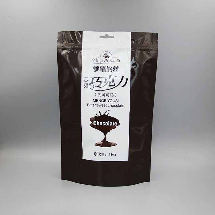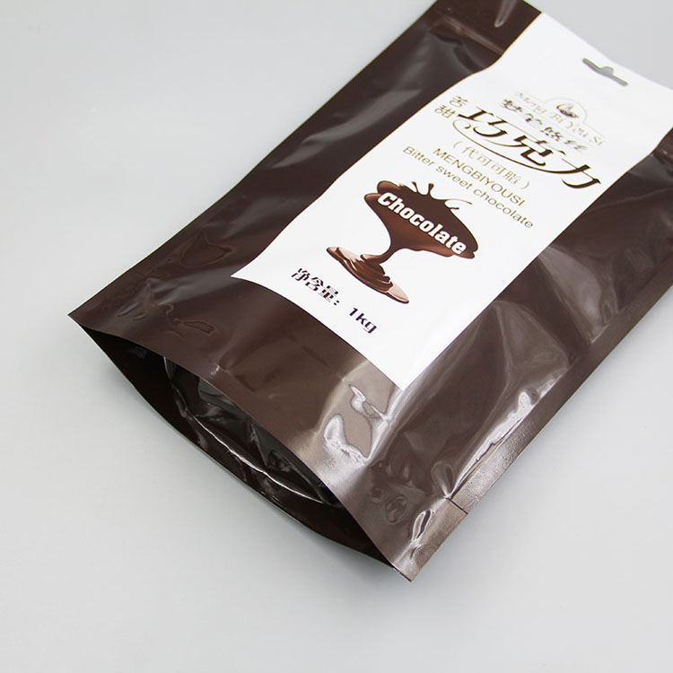 本產品為亮面鍍鋁自立拉鏈袋。鋁箔是巧克力包裝的標配,因為巧克力本身容易融化,而鋁箔具有防潮作用,還有一定的遮光性,能很好的保證巧克力的穩定性,避免融化。拉鏈上部易撕口,能幫助消費者輕松打開包裝袋。產品設有拉鏈,隨時開啟、封閉,能夠保持食品新鮮,也更方便攜帶和存儲。